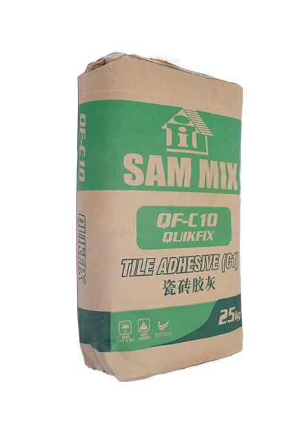 QUIKFIX (QF-C10) is a single component thin bed polymer modified cementitious tile adhesive, specially formulated for small (≤300mm x 300mm) ceramic wall and floor tiles. It is suitable for interior and exterior use in thin bed application (3mm to 10mm). It is an improved cementitious adhesive (C1) with slip resistant (T). Ideal for interior and exterior tiling applications over concrete and rendered surface.