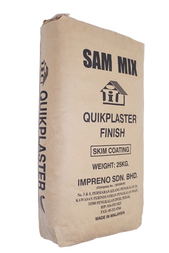 QUIKPLASTER FINISH (SKIM COAT FINISH) is a high quality polymer modified water-resistant cement-based thin plaster for finishing on wall and ceilings. It can be used on concrete and rendered surfaces to give a high quality plaster surface suitable for either painting or wallpapering.