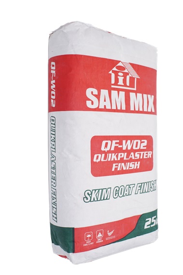 QUIKPLASTER FINISH (SKIM COAT FINISH) is a high quality polymer modified water-resistant cement-based thin plaster for finishing on wall and ceilings. It can be used on concrete and rendered surfaces to give a high quality plaster surface suitable for either painting or wallpapering.